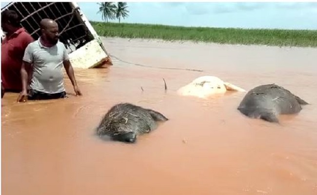 ವಾಹನದಲ್ಲಿದ್ದ ಮಹಿಳೆ ಹಾಗೂ ಚಾಲಕನನ್ನು ಸ್ಥಳೀಯರು ರಕ್ಷಿಸಿದ್ದು, ವಾಹನದೊಳಗೆ ಸಿಲುಕಿದ ಜಾನುವಾರುಗಳು ಸಿಲುಕಿ ಮೃತಪಟ್ಟಿವೆ. ಎರಡು ಎಮ್ಮೆ ಹಾಗೂ ಒಂದು ಹಸು ನೀರಿನಲ್ಲಿ ಮುಳುಗಿ ಮೃತಪಟ್ಟಿವೆ.