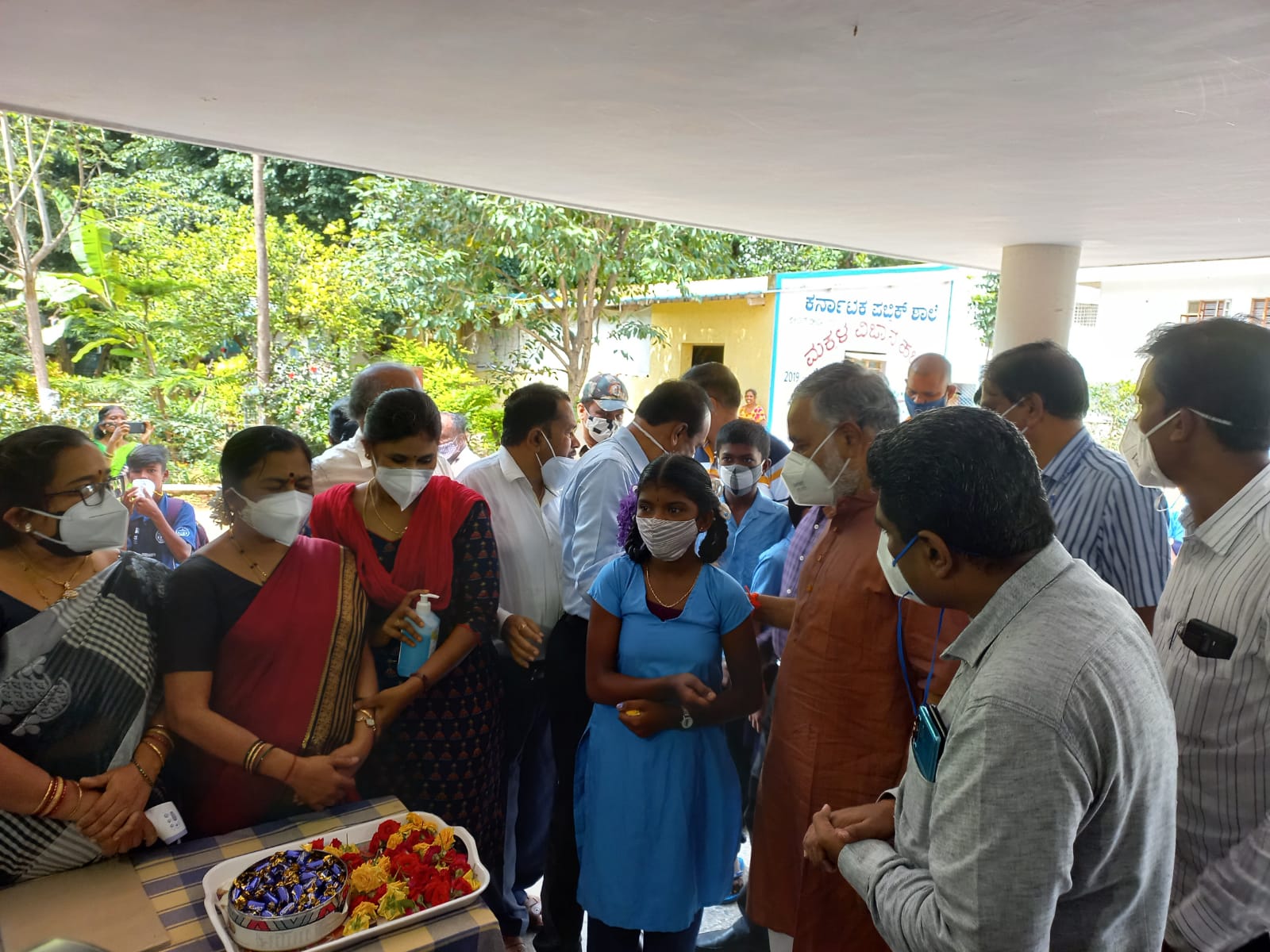 ಇಂದಿನಿಂದ 6, 7 ಮತ್ತು 8 ನೇ ತರಗತಿಗಳ ಭೌತಿಕ ತರಗತಿಗಳು ಆರಂಭ ಹಿನ್ನೆಲೆಯಲ್ಲಿ ಬೆಂಗಳೂರಿನ ಜೆ.ಬಿ ನಗರದಲ್ಲಿರುವ ಕರ್ನಾಟಕ ಪಬ್ಲಿಕ್ ಸ್ಕೂಲ್ಗೆ ಭೇಟಿ ನೀಡಿದ ಪ್ರಾಥಮಿಕ ಮತ್ತು ಪ್ರೌಢ ಶಿಕ್ಷಣ ಹಾಗೂ ಸಕಾಲ ಸಚಿವರಾದ ಬಿ.ಸಿ ನಾಗೇಶ್ ಅವರು ವಿದ್ಯಾರ್ಥಿಗಳಿಗೆ ಚಾಕೊಲೇಟ್ ನೀಡಿ ಶಾಲೆಗೆ ಸ್ವಾಗತಿಸಿದರು.