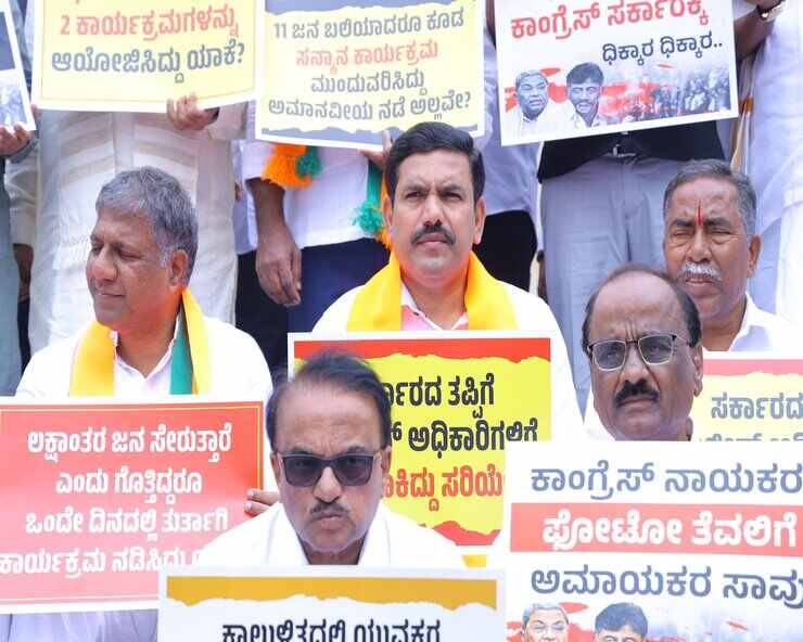 ವಿಧಾನಮಂಡಲ ಅಧಿವೇಶನ ಆರಂಭಕ್ಕೆ ಮುನ್ನ ಇಂದು ಬಿಜೆಪಿ ರಾಜ್ಯಾಧ್ಯಕ್ಷ, ಶಾಸಕ ಬಿವೈ ವಿಜಯೇಂದ್ರ ನೇತೃತ್ವದಲ್ಲಿ ಪ್ರತಿಭಟನೆ ನಡೆಸಲಾಯಿತು. ಸರ್ಕಾರದ ಬೇಜವಾಬ್ದಾರಿತನದಿಂದ 11 ಜನ ಅಮಾಯಕರ ಸಾವಿಗೆ ಕಾರಣವಾದ ಚಿನ್ನಸ್ವಾಮಿ ಸ್ಟೇಡಿಯಂ ಕಾಲ್ತುಳಿತ ಘಟನೆ ಖಂಡಿಸಿ ಇಂದು ಅಧಿವೇಶನಕ್ಕೂ ಮುನ್ನ ವಿಧಾನಸೌಧದ ಗಾಂಧಿ ಪ್ರತಿಮೆಯ ಮುಂಭಾಗದಲ್ಲಿ NDA ಮೈತ್ರಿಕೂಟದ ಶಾಸಕರೊಂದಿಗೆ ಪ್ರತಿಭಟನೆ ನಡೆಸಲಾಗಿದೆ. ರಾಜ್ಯ ಸರ್ಕಾರದ ಆಡಳಿತ ವೈಫಲ್ಯದಿಂದ ಬೆಂಗಳೂರಿನ ಐಪಿಎಲ್ ಸಂಭ್ರಮಾಚರಣೆಯ ಸಂದರ್ಭದಲ್ಲಿ ಮುಖ್ಯಮಂತ್ರಿಗಳು ಹಾಗೂ ಉಪಮುಖ್ಯಮಂತ್ರಿಗಳ ಪ್ರಚಾರದ ಗೀಳಿಗೆ 11 ಜನ ಅಮಾಯಕರನ್ನು ಬಲಿಪಡೆದಿದೆ ಎಂದು ಬಿಜೆಪಿ ಪ್ರತಿಭಟನೆ ನಡೆಸಿದೆ.