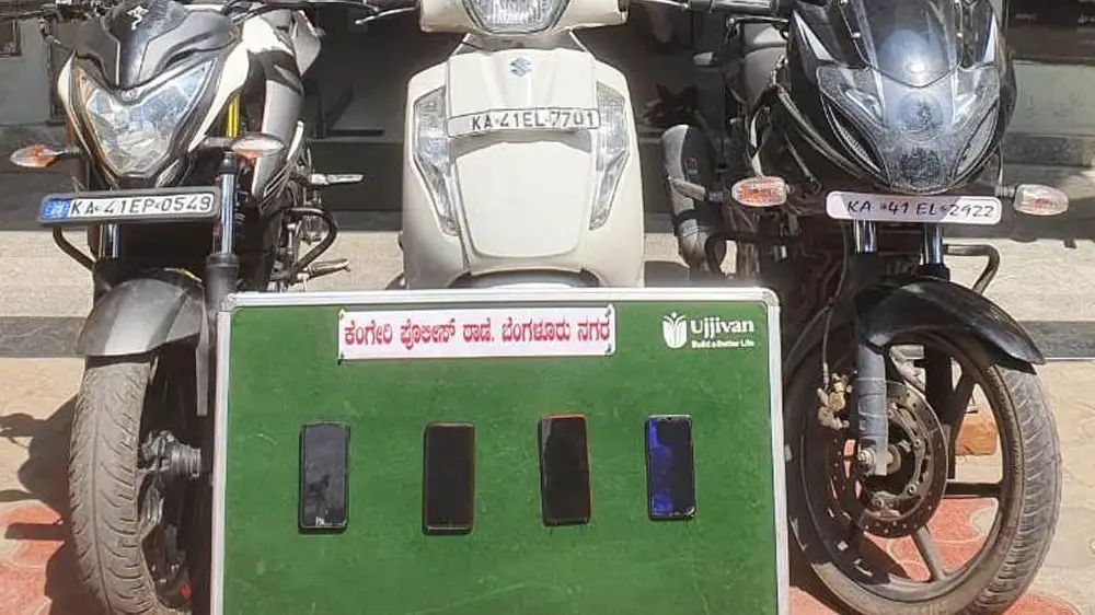 ಮೊಬೈಲ್ ಫೋನ್ಗಳನ್ನು ಸಾರ್ವಜನಿಕರಿಂದ ಎಗರಿಸುತ್ತಿದ್ದ ಆರೋಪಿಯೊಬ್ಬನನ್ನು ಕೆಂಗೇರಿ ಠಾಣೆ ಪೊಲೀಸರು ಬಂಧಿಸಿ 4 ಲಕ್ಷ ಬೆಲೆಬಾಳುವ ನಾಲ್ಕು ಮೊಬೈಲ್ ಹಾಗೂ ಮೂರು ದ್ವಿಚಕ್ರ ವಾಹನಗಳನ್ನು ವಶಪಡಿಸಿಕೊಂಡಿದ್ದಾರೆ.