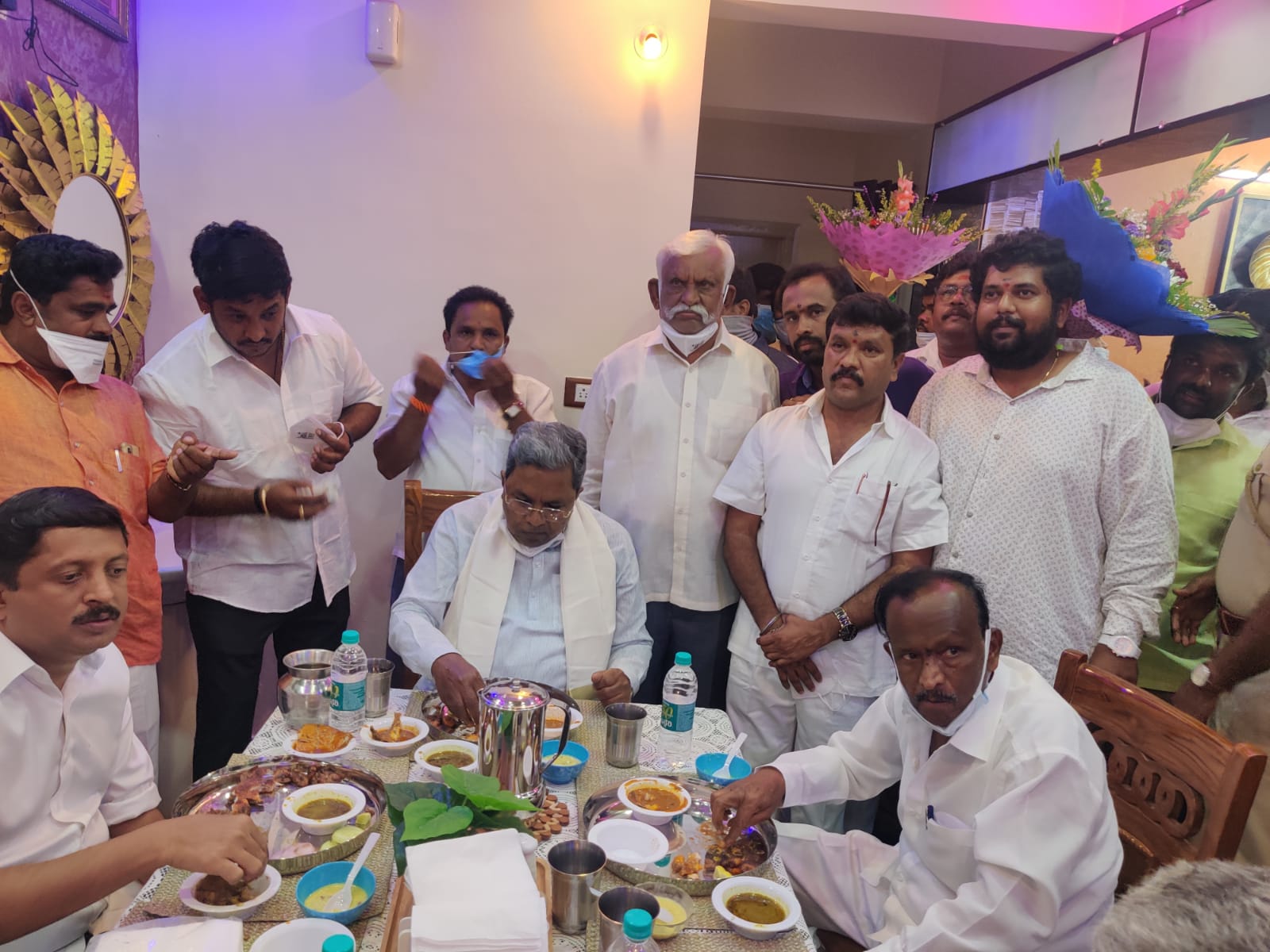 ಹೀಗೆ ಒಂದೇ ಟೇಬಲ್ ನಲ್ಲಿ ಅಕ್ಕಪಕ್ಕ ಕುಳಿತ ವಿಪಕ್ಷ ನಾಯಕ ಸಿದ್ದರಾಮಯ್ಯ ಹಾಗೂ ಸಚಿವ ಎಂಟಿಬಿ ನಾಗರಾಜ್ ನಾಟಿ ಕೋಳಿ ಸಾರಿನ ರುಚಿ ಸವೆದದ್ದು ಬೆಂಗಳೂರು ಗ್ರಾಮಾಂತರ ಹೊಸಕೋಟೆಯಲ್ಲಿ. ಇಂದು ಹೊಸಕೋಟೆ ಪಟ್ಟಣದ ಕನಕ ನಗರದಲ್ಲಿ ಕನಕ ಸಮೃದ್ದ ಕ್ರೇಡಿಟ್ ಕೋ ಆಪರೇಟಿವ್ ಸೊಸೈಟಿ ಉದ್ಘಾಟನ ಕಾರ್ಯಕ್ರಮಕ್ಕು ಮುನ್ನ ಕಾಂಗ್ರೆಸ್ ಮುಖಂಡರೊಬ್ಬರ ಮನೆಯಲ್ಲಿ ಇಬ್ಬರು ಒಟ್ಟಾಗಿ ಕುಳಿತು ರಾಗಿ ಮುದ್ದೆ, ನಾಟಿ ಕೋಳಿ ಸಾರಿನ ಊಟ ಮಾಡಿದರು.