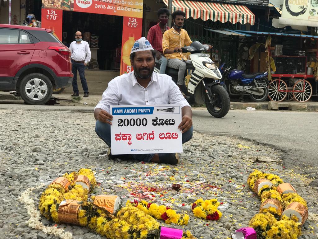 ಬೆಂಗಳೂರು: ರಸ್ತೆಗಳಲ್ಲಿರುವ ಗುಂಡಿಯ ಸುತ್ತ ರಂಗೋಲಿ ಹಾಕಿ, ಹೂವಿನಿಂದ ಅಲಂಕರಿಸಿ, ಆರತಿ ಎತ್ತಿ ಪೂಜೆ. ಅದರ ಸುತ್ತಮುತ್ತ ಸರ್ಕಾರದ ವಿರುದ್ಧ ಬರಹಗಳಿರುವ ಬೋರ್ಡ್ ಹಿಡಿದು ನಿಂತಿರುವ ಬಿಳಿ ಟೋಪಿಧಾರಿಗಳು. ಅವರ ಬಾಯಲ್ಲಿ ಭ್ರಷ್ಟಾಚಾರದ ವಿರುದ್ಧ ಆಕ್ರೋಶದ ಘೋಷಣೆಗಳು ಆಮ್ ಆದಿಮಿ ಪಾರ್ಟಿಯು ಬುಧವಾರ ಬೆಂಗಳೂರಿನಲ್ಲಿ ಹಮ್ಮಿಕೊಂಡಿದ್ದ ರಸ್ತೆಗುಂಡಿ ಹಬ್ಬ ನಡೆಯುತ್ತಿರುವ ದೃಶ್ಯ. ಪಕ್ಷದ ರಾಜ್ಯ ಸಂಚಾಲಕ ಪೃಥ್ವಿ ರೆಡ್ಡಿ ಮತ್ತು ಬೆಂಗಳೂರು ನಗರದ ಅಧ್ಯಕ್ಷ ಮೋಹಕ ದಾಸರಿ ಅವರನ್ನು ಒಳಗೊಂಡ ಬೆಂಗಳೂರಿನ ಎಲ್ಲಾ ವಿಧಾನಸಭಾ ಕ್ಷೇತ್ರಗಳಲ್ಲಿ ವಿನೂತನ ಪ್ರತಿಭಟನೆ ನೆಡೆಯಿತು.