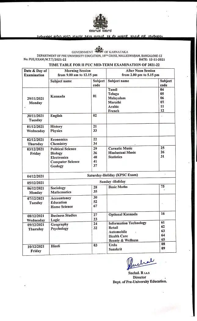 ಬೆಂಗಳೂರು: ದ್ವಿತೀಯ ಪಿಯುಸಿ ವಿದ್ಯಾರ್ಥಿಗಳಿಗೆ ಮಧ್ಯ ವಾರ್ಷಿಕ ಪರೀಕ್ಷೆ ವೇಳಾಪಟ್ಟಿ ಪ್ರಕಟ ಮಾಡಲಾಗಿದೆ. ರಾಜ್ಯದಂತ ಏಕಕಾಲದಲ್ಲಿ ದಿನಾಂಕ 29-11-2021ರಿಂದ 10-12-2021ರ ತನಕ ಈ ಎಕ್ಸಾಂ ನಡೆಯಲಿದೆ ಅಂತ ಪದವಿ ಪೂರ್ವ ಇಲಾಖೆ ತಿಳಿಸಿದೆ.