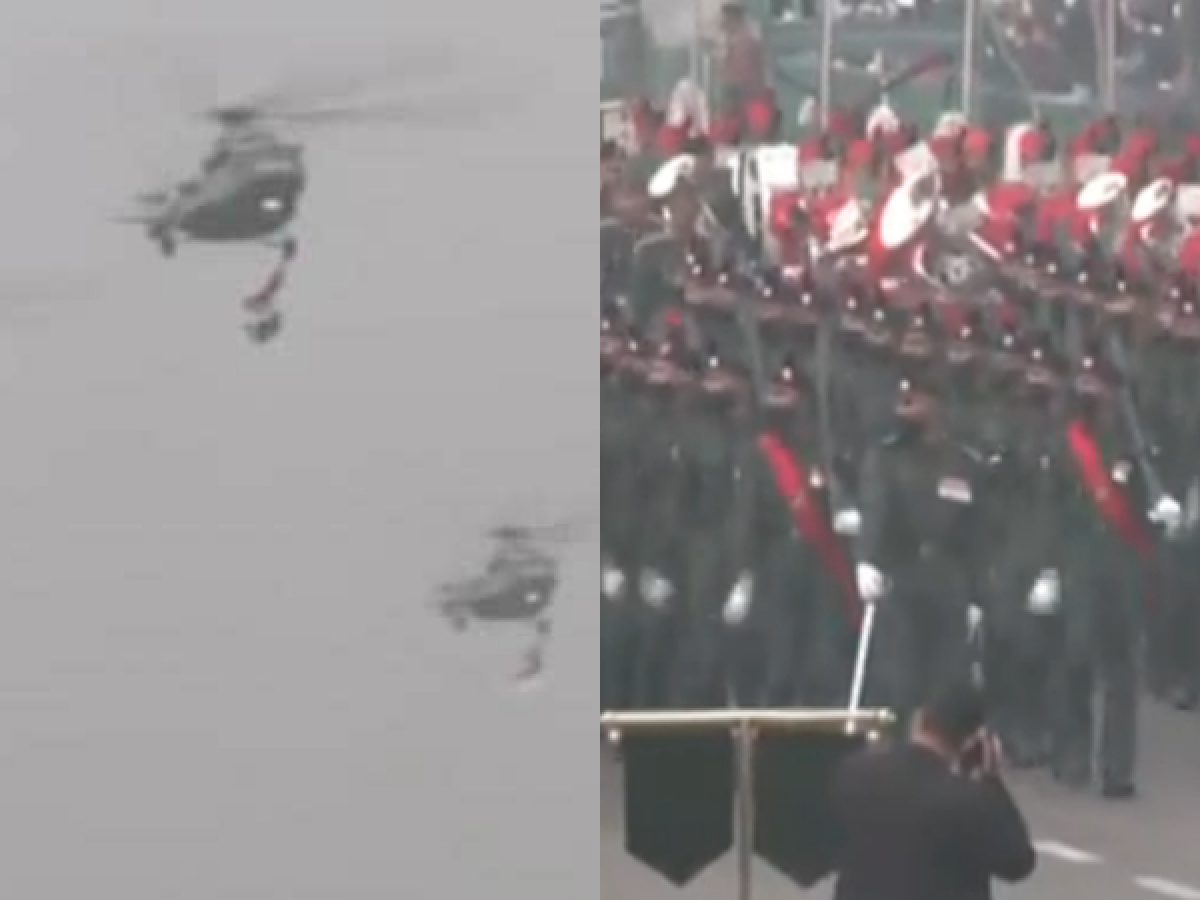 ದೆಹಲಿಯ ರಾಜಪಥನಲ್ಲಿ ಪರೇಡ್ಗಾಗಿ ಸೈನಿಕರು ಪೂರ್ಣ ಉಡುಗೆಯಲ್ಲಿ ಪೂರ್ವಾಭ್ಯಾಸ ಮಾಡಿದವು. ಇನ್ನೊಂದೆಡೆ ಹೆಲಿಕಾಪ್ಟರ್ಗಳು ಇಂದು ದೆಹಲಿಯ ರಾಜ್ಪಥ್ನ ಮೇಲೆ ಹಾರಾಡಿದವು.